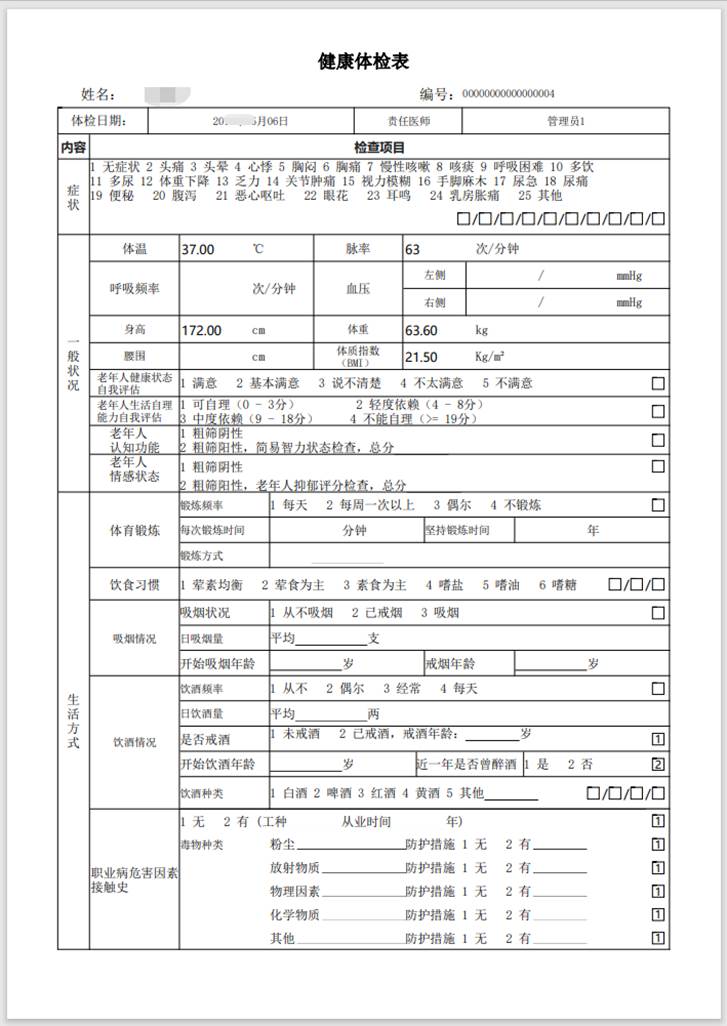 • 支持《居民健康檔案》建立、健康檔案質控系統、LIS數據采集對接、上傳區域公衛平臺、公衛DR上傳對接、總檢智能評價、批量報告打印、慢病隨訪管理、老年人健康管理、中醫體質辨識等幾大功能。
